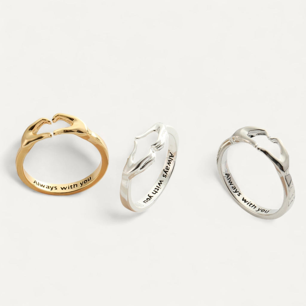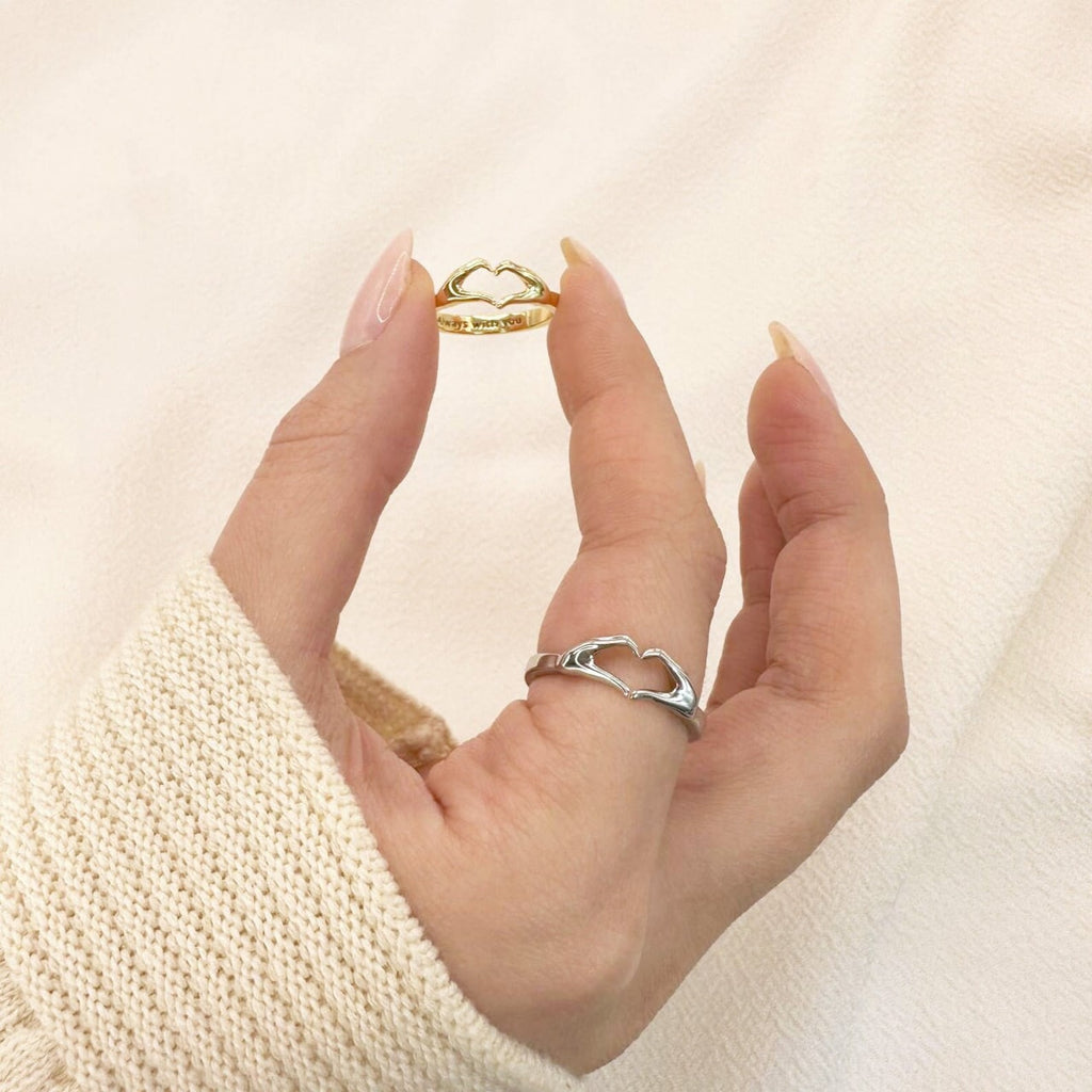 Descrição: Inspirados no amor e feitos com cuidado, estes anéis apresentam um design de coração em forma de mão. Feitos com um núcleo de cobre durável, eles vêm em platina, ouro e prata. O tratamento de galvanoplastia adiciona resistência extra e a abertura ajustável permite um ajuste perfeito para todos.